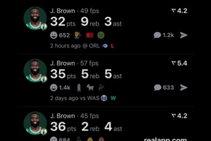 过去5场比赛,布朗四次砍下30+,赛季至今,他场均砍下28.1分。