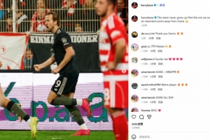 凯恩也在赛后通过社媒晒出自己进球后的庆祝照,并配文:“这支球队永不放弃!没拿到我们想要的胜利,但从客场带走重要一分💪”。