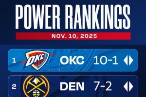 体育资讯11月11日讯 官方发布了最新一期球队实力榜,其中前两名没有变化,依旧是雷霆和掘金。而火箭升至了第三位,尼克斯也升到了第四位。