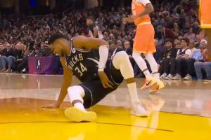 GIF-字母哥上篮落地,捂着腿根,受伤了