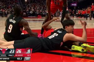 GIF-杨瀚森跟对手抢球!右手示意裁判快吹快吹!
