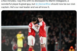 阿森纳拥趸摩根在社媒晒出赖斯本场戴上队长袖标的照片,写道:“赖斯昨晚比赛中首次戴上阿森纳队长袖标,尽管只有几分钟。我这么说并不是出于对厄德高的不敬,他也是一名出色的球员、很棒的伙计,但是赖斯现在应该成为球队队长了,他是我们真正的领袖,这我们都知道的。”