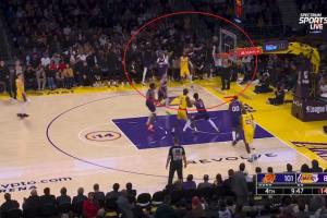 末节9分48秒,时间静止,湖人的进攻时间也锁定在了15秒,这个回合最终文森特轰进底角三分