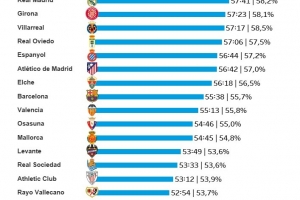 体育资讯12月2日讯 Opta统计了本赛季西甲各队的场均净比赛时间,并列出榜单,皇马排名第三位。