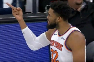 GIF-唐斯转身打史密斯抛投命中,裁判吹进攻犯规,尼克斯挑战成功变2+1