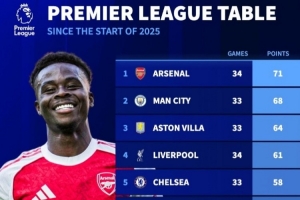 体育资讯12月5日讯 《转会市场》统计了2025年英超总积分情况,阿森纳多赛1场力压曼城居首。