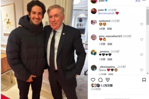 帕托社媒晒出与现任巴西主帅安切洛蒂的合照,并@安切洛蒂,帕托效力米兰期间曾在安切洛蒂麾下踢球。