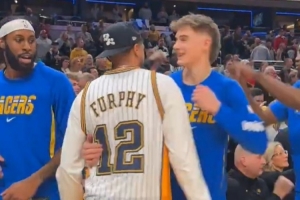 这场比赛,养伤中的哈利伯顿来到场边观赛,他身穿队友弗菲的球衣以示支持,并与弗菲本人互动。