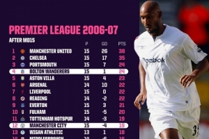 06-07赛季英超第15轮结束后积分榜: