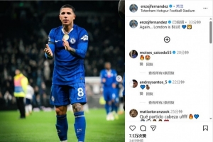 体育资讯11月2日讯 2025-26赛季英超第10轮焦点战,切尔西1-0击败热刺。赛后,蓝军中场恩佐在社交媒体晒图,庆祝球队获胜。