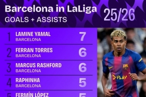 巴萨本赛季联赛参与进球榜: