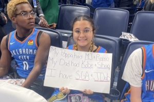 这位雷霆球迷手举手写牌,上面写道:“我的爷爷有乔丹和皮蓬,我的爸爸有科比和奥尼尔,而我有亚历山大和杰伦-威廉姆斯。”